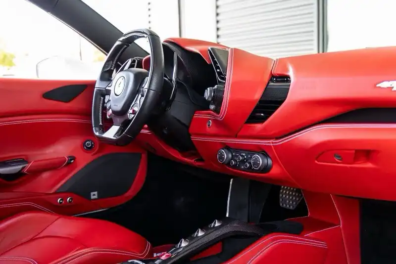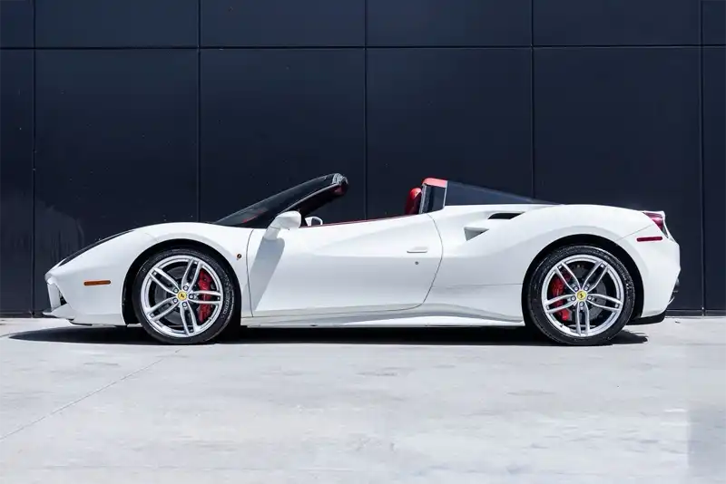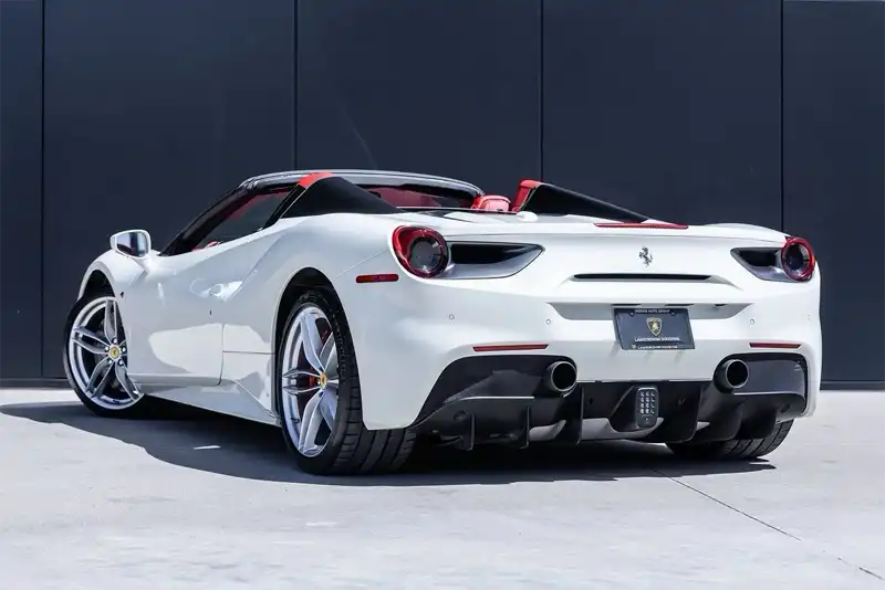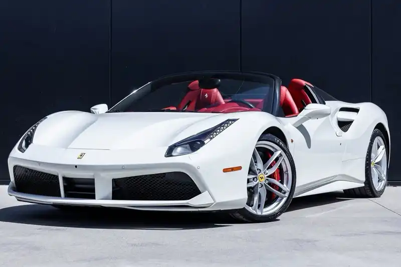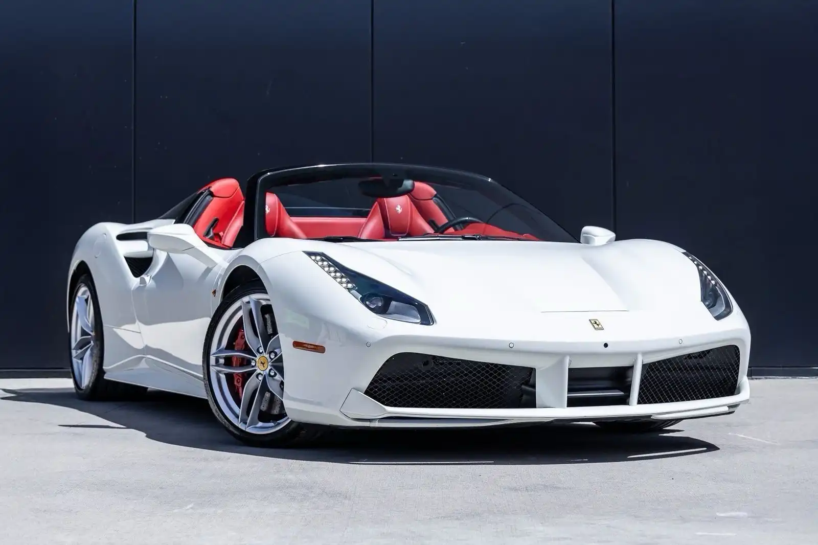 Rent a White Ferrari 488 GTB spyder — a 2-seater Supercar with 3.9L Twin-Turbocharged V8 engine, 661 hp, and 561 lb-ft Torque